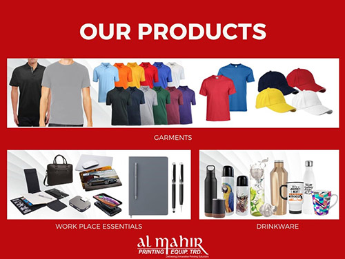Al Mahir?Printing Equip. Trad. Since 2001 dedicated services to meet the various needs of Screen Printing, Digital printing industry and Advertising Agencies from GCC, Middle East and African countries. Al Mahir also has wide range of Sublimation Product and Promotional Items. We are specialized in promotional gift items printing where you get all gift items printing solution in one stop like Digital Print, Offset Print, Sublimation, and UV Printing. We also provide in-House Screen Printing Services on Small and Large Scale with our sister concern Al Mahir Silk Screen??