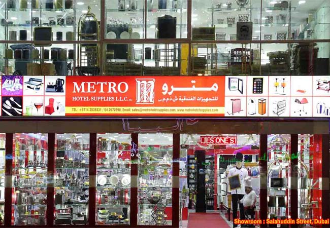 Keeping an eye on the booming hospitality industry. especially in the U.A.E. and the Gulf region we at Metro have developed and introduced a completely new eco-friendly range of products. We produce and stock a large varieties of high quality bed linen, table linen in polycotton and 100% cotton, 100% polyester table linen, satin band table linen, I.V. leaf designs, towel and other accessories. Since we have all kinds of fabric of 280 cm width in stock we can fulfill your requirements for specific sizes. We also produce other guest room related items such as down duvet & pillows, poly fiber/micro fiber duvet & pillows, mattress protectors, blankets, bed skirts, bed sheets, pillow covers, cushion covers, duvet covers, etc. We also have varieties of other hotel products such as front office/room service trolley & carts, sign stands, ashtray, house keeping linen trolleys, banquet furniture/dance floor, etc. Our expertise in creating uniforms is one of our main advantage in the U.A.E market. With our current strength of 50 tailors, we supply to leading five star properties. "Our showroom is situated in Dubai in the heart of Deira near Abu Baker Al Siddique Metro Station at Salahuddin street". Our well furnished showroom showcases a wide range of hotel and catering products to select and purchase. Head Office: Metro Hotel Supplies LLC Al Qusais, Dubai, UAE Tel : +971 4 2672698, Fax: +971 4 2672798? sales@metrohotelsupplies.com Metro Hotel Supplies LLC - Showroom Salahuddin Street, Deira, Dubai (Near Abu Baker Al Siddique Metro Station) Tel : +971 4 3539331, Fax: +971 4 3539334 showroom@metrohotelsupplies.com Branches: Metro Hotel Equipments & Supplies Pvt. LTD Cochi,Vyttila, Kerala, INDIA Tel:+91 484 2301937, Fax:+91 484 2301939 sales@metrohotelequipments.com Metro United LLC Ruwi, Muscat, OMAN Tel : +968 247 00103 Fax: +968 247 00117 metrounited@yahoo.com